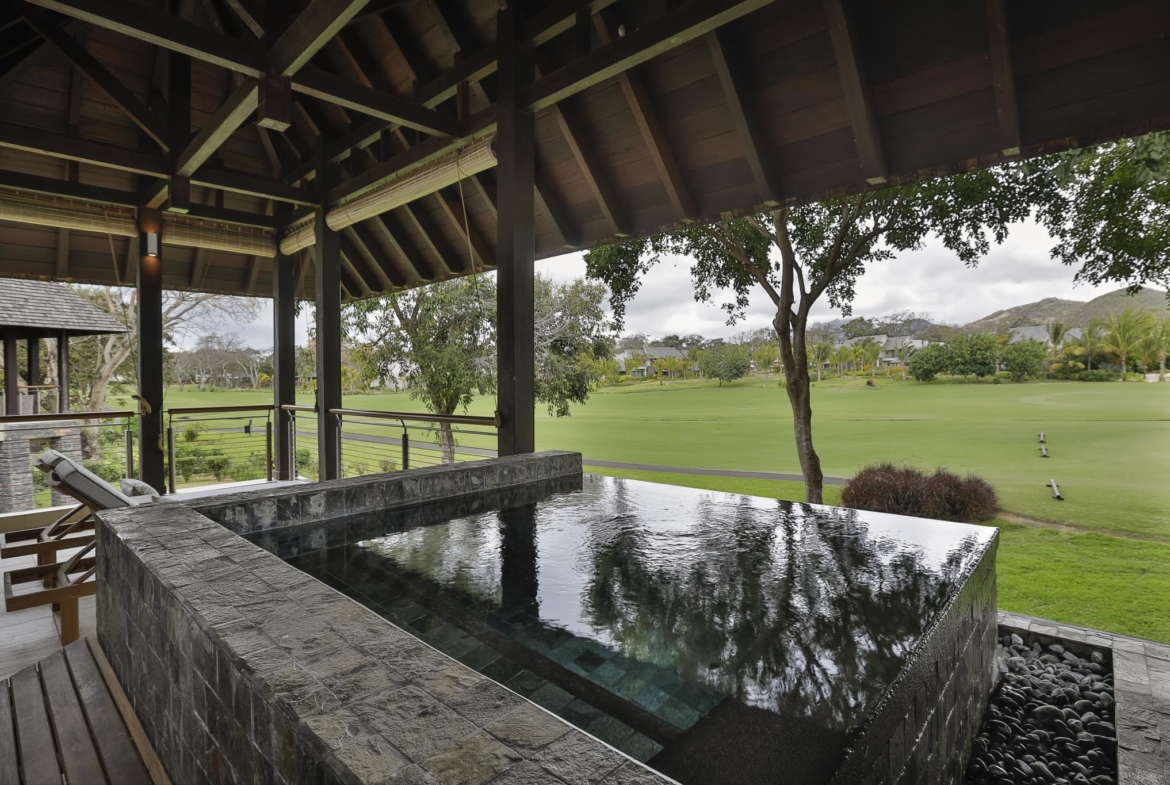 Situé au 1er et dernier étage, ce bien de luxe possède une varangue couverte de 40 m2 ombragé par une toiture dont la charpente apparente ajoute un charme traditionnel. Cette terrasse devient un espace de vie extérieur relaxant pour profiter de la plunge pool.