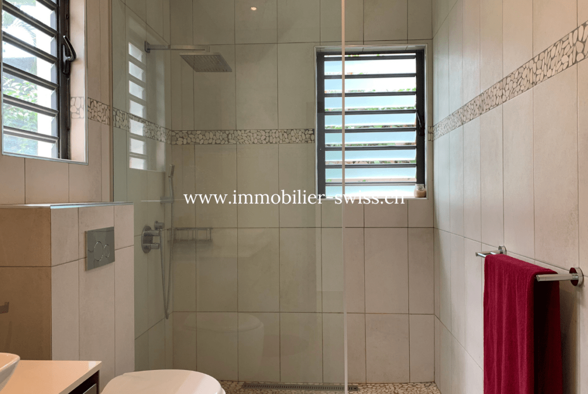 Cette villa, possède également un garage fermé avec espace de rangement, une arrière-cuisine, une buanderie. Elle est entièrement climatisée par des climatiseurs discrets et encastrés.
