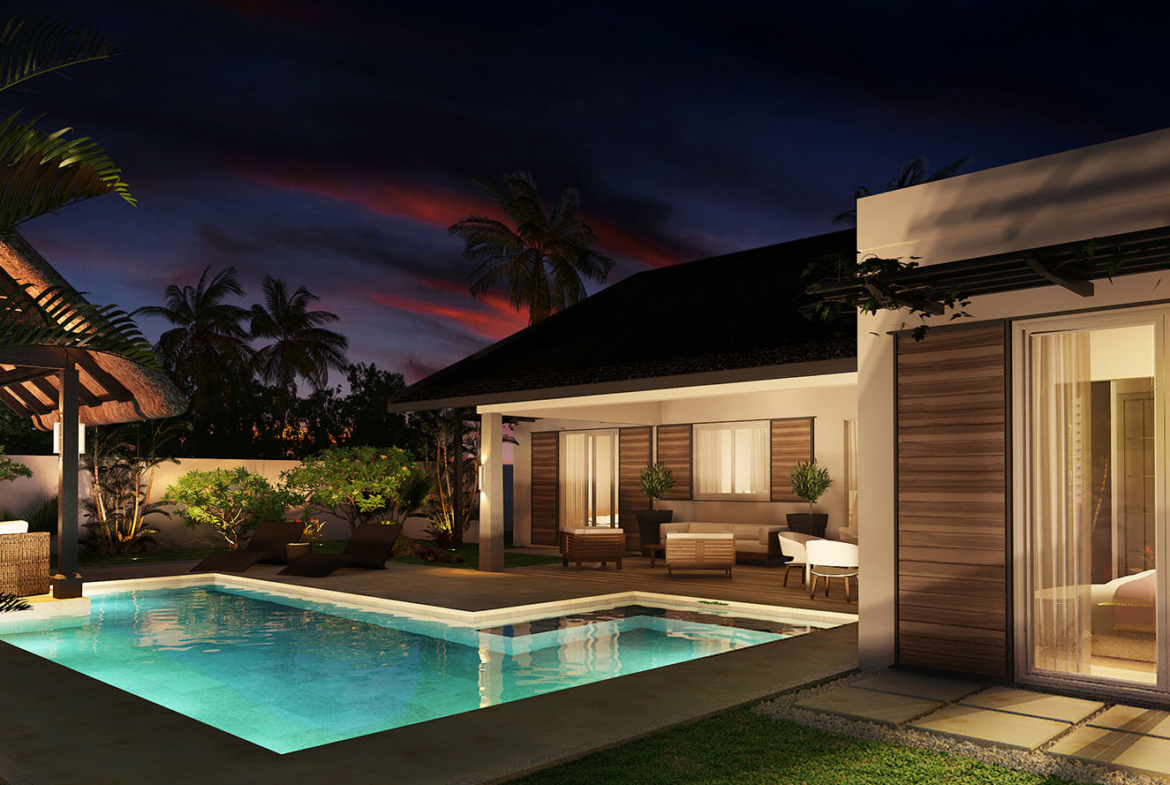 Cette pièce de vie s’ouvre sur une terrasse qui se prolonge sur toute la devanture de la maison. Pour profiter pleinement du climat mauricien, une ravissante plage, une grande piscine et un kiosque, nichés dans un jardin tropical privé, invitent à la détente.